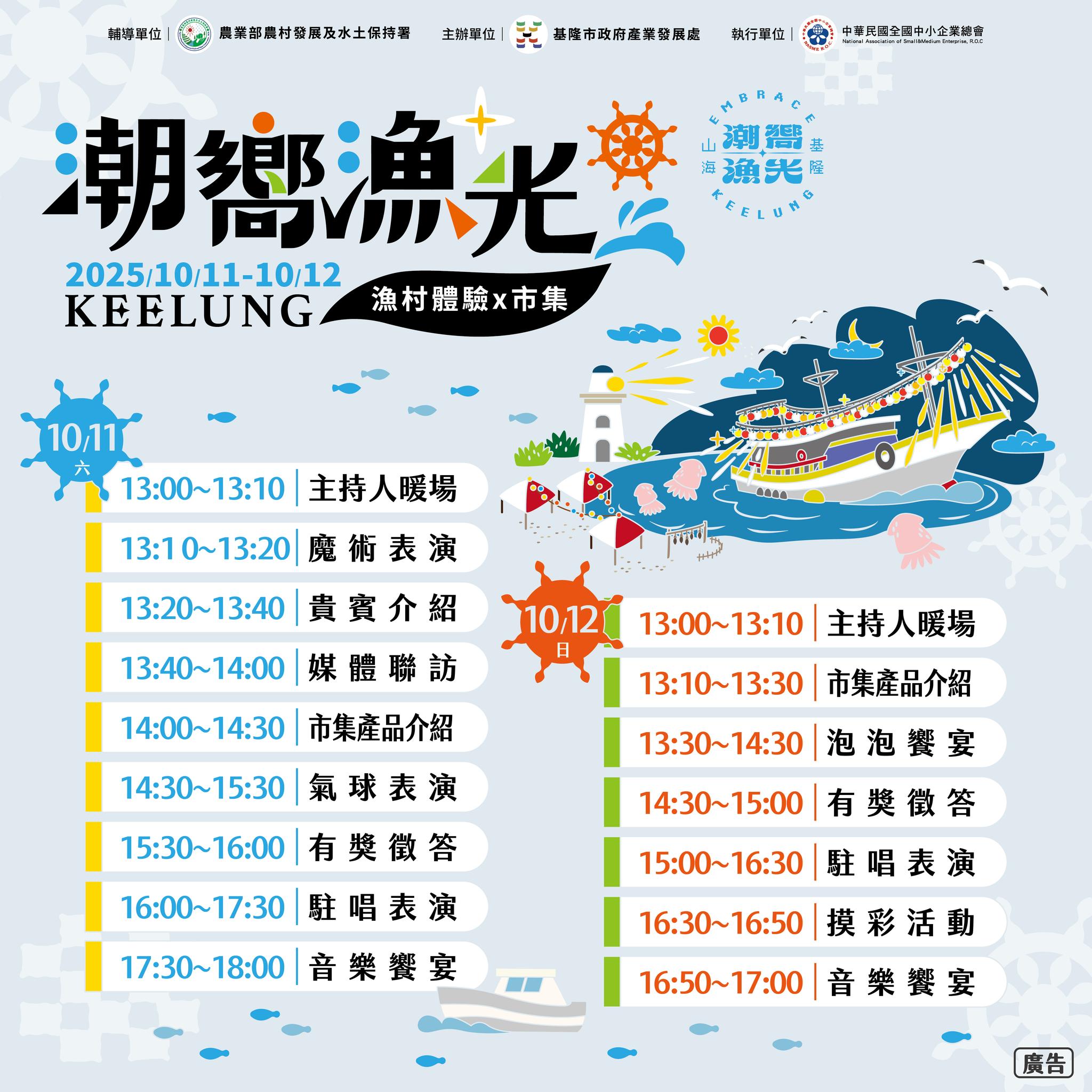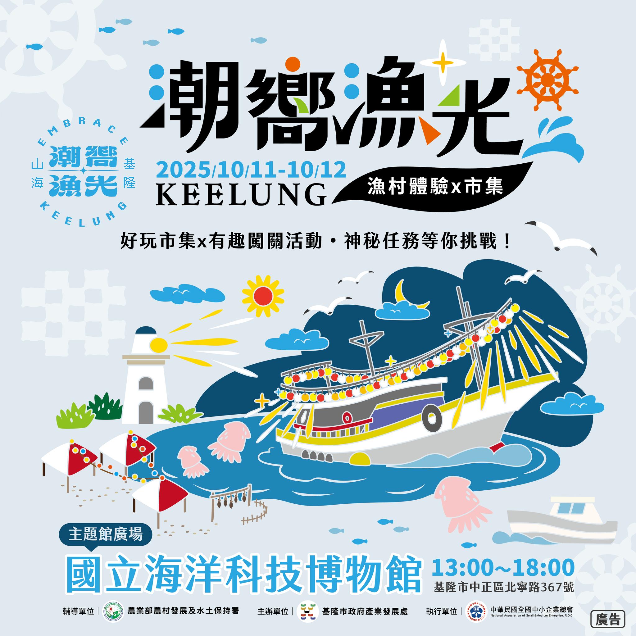 基隆市政府主辦的年度特色活動「潮嚮市集」將於10月11日至12日熱鬧登場,今年以「漁光」為主題,結合展覽、市集、體驗與導覽,帶領民眾走進八斗子漁村,在藍天與海風間感受山海交融的生活節奏與人文魅力。