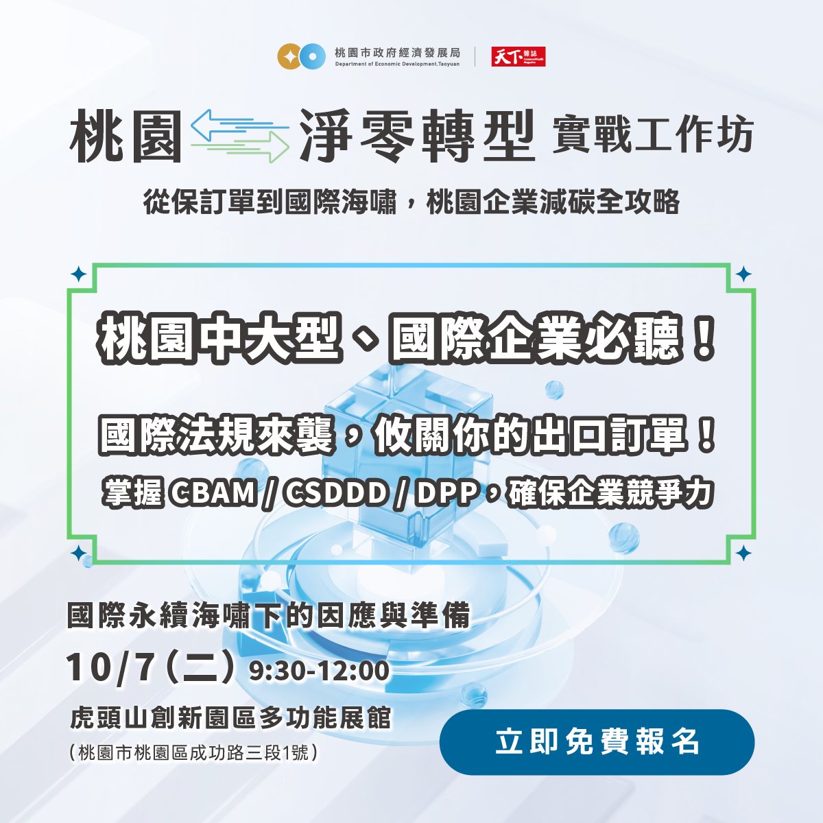 當全球企業正陷入AI革命與淨零轉型的雙重浪潮,桃園市政府經濟發展局今(7)日與《天下雜誌》及天下永續會攜手,於虎頭山創新園區舉辦「桃園淨零轉型實戰工作坊」第二場,主題為「佈局國際永續新世代」。活動匯集產官學專家,從AI、碳邊境調整機制(CBAM)到國際減碳方法學(SBTi)等關鍵議題切入,協助桃園企業在全球減碳競賽中搶占先機。