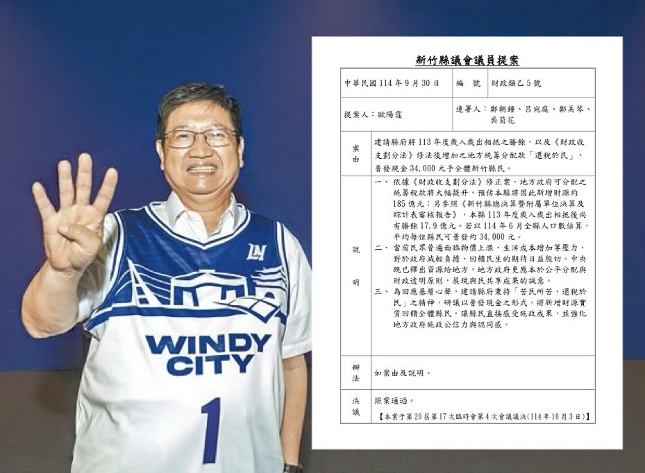 這場風波起於民進黨籍縣議員歐陽霆在臨時會提案,主張將去年度歲計賸餘17億9千萬元,加上《財政收支劃分法》修法後增加的185億元地方統籌分配款,用於「還稅於民」,讓全縣民眾每人可領3萬4千元現金。該案獲跨黨派議員連署支持,並在議會表決通過,隨即登上社群熱搜。