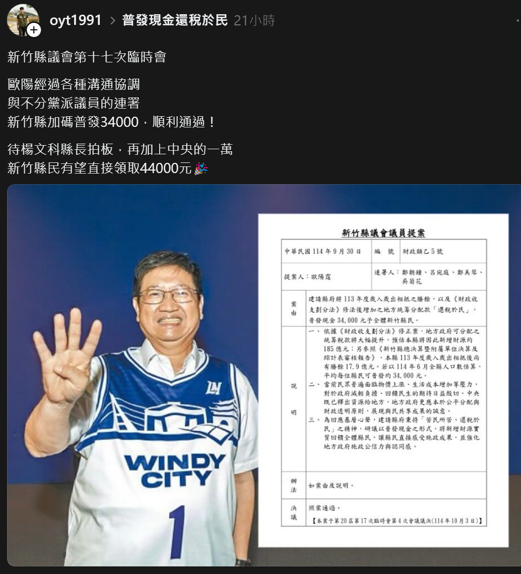 歐陽霆更在社群發文寫道:「新竹縣加碼普發34000,順利通過!」並提及「待縣長拍板後再加上中央的1萬,縣民有望領到4.4萬」。貼文短短幾小時內湧入上千則留言,不少人又驚又喜:「這是真的嗎?新竹縣這麼大方?」、「希望不要只是畫餅」、「竹北物價那麼高,這筆錢剛好補生活」。