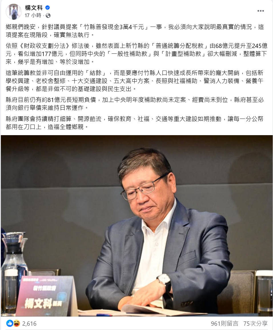 然而,縣長楊文科7日晚間10時發出聲明,明確表示「目前無法執行」。他指出,新法雖讓統籌分配稅款看似增加177億元,但中央同步削減了一般性與計畫型補助款,整體財源幾乎打平,「這筆錢不是可以自由運用的結餘,而是必須應付教育、交通、長照、警消與社福等龐大支出。」