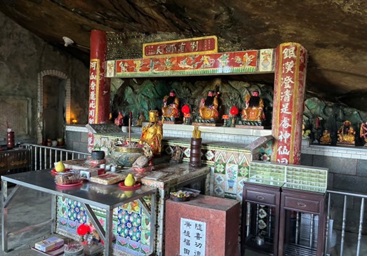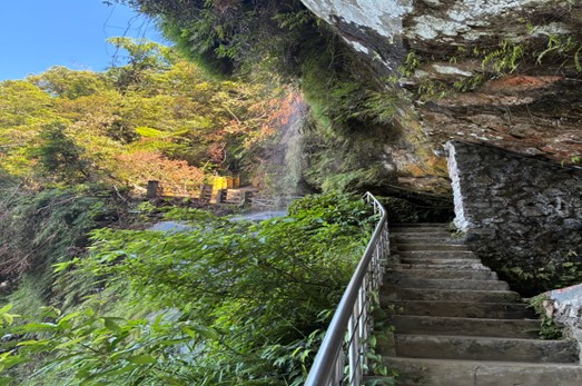 銀河洞依山鑿建,洞外水流沿石壁緩緩垂落,縱使近日少雨,仍可感受山泉的清涼氣息。這座超過百年歷史的古洞,曾是修行者的棲居之所,如今成為旅人尋幽訪古的秘境。