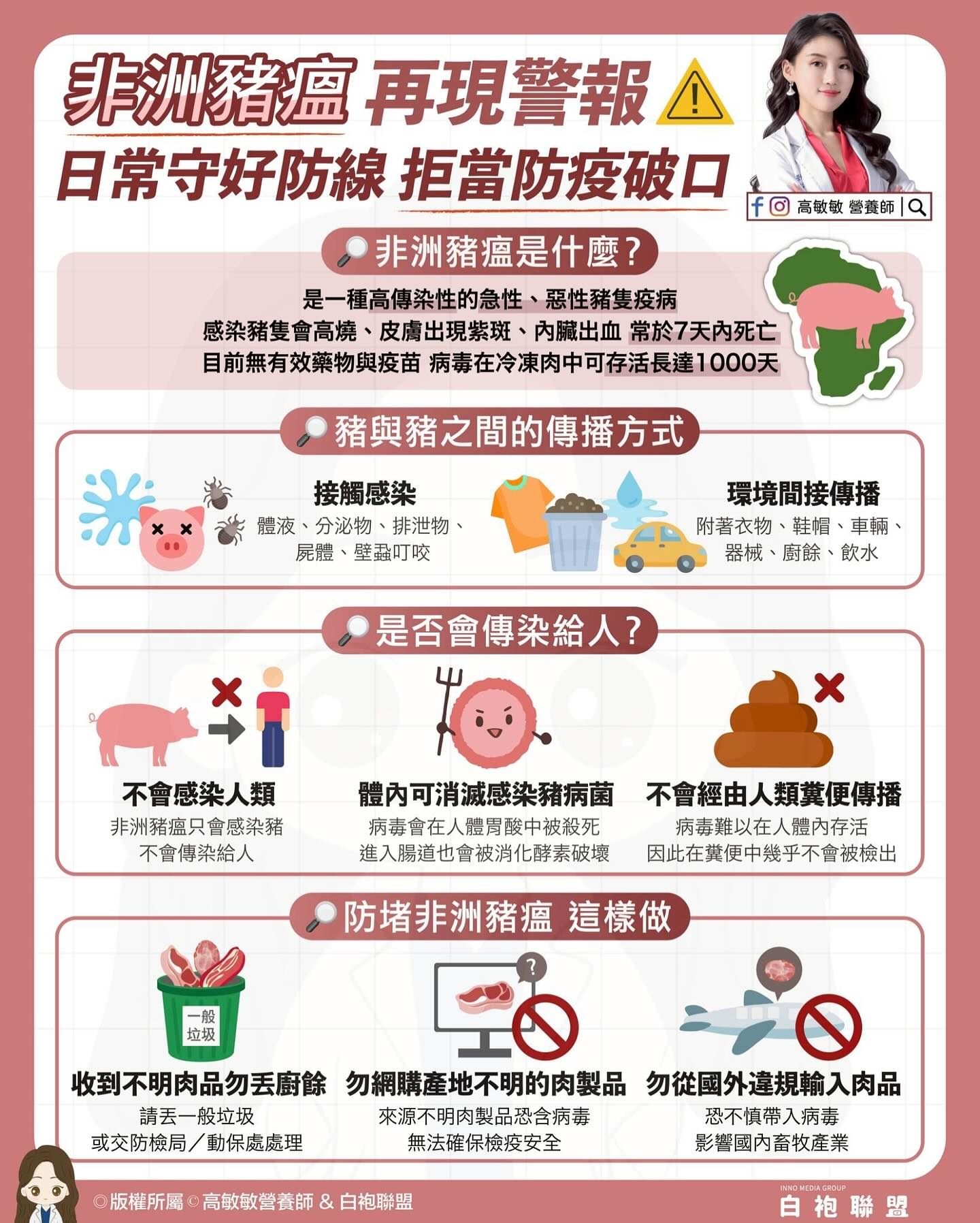 台中市22日出現疑似非洲豬瘟疫情,引發民眾憂心「吃豬肉會不會中毒、會不會傳染?」。對此,營養師高敏敏與農業部部長陳駿季皆出面澄清,強調非洲豬瘟只在豬隻之間傳播,對人類不具感染性,請民眾不必過度恐慌。