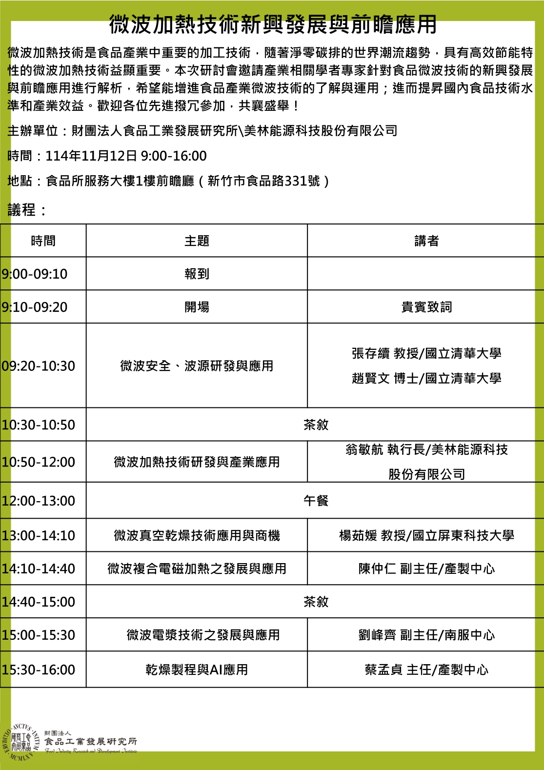 研討會邀請多位專家分享微波加熱在食品、農產、冷凍調理食品及醫療營養品等領域的最新應用成果,內容涵蓋從基礎技術原理到產業化實例,讓參與業者能一次掌握市場脈動與未來方向。