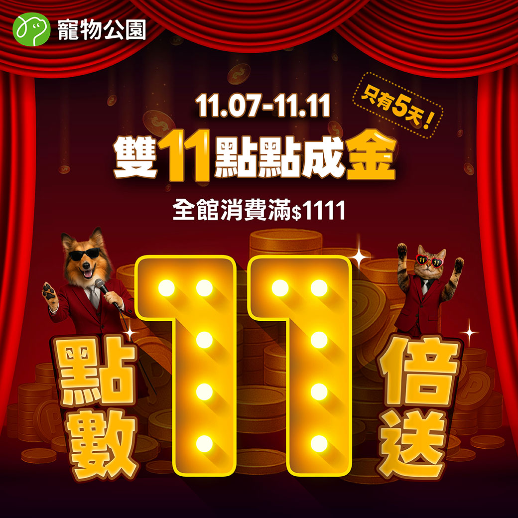 為迎戰雙11購物節,寵物公園加碼推出「雙11寵愛日」限時活動,11月7日至11日間凡單筆消費滿1,111元,即享11倍會員點數回饋。全館同步祭出「買一送一」、「滿千折百」、「現折最高2,000元」等多重優惠,掀起一波「毛孩也瘋搶」的消費熱潮。